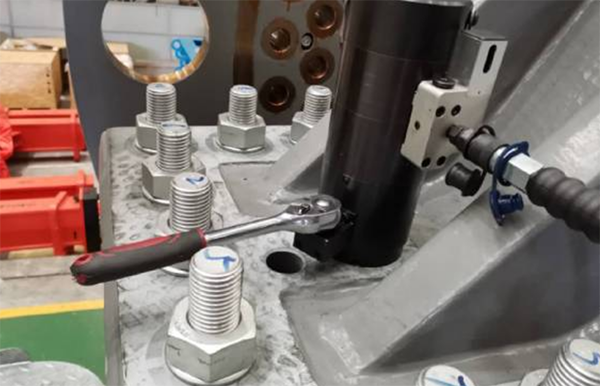拉緊之后需要拆卸雙級(jí)螺栓拉伸器則和安裝相反,需要泄壓完全之后使用手動(dòng)扭矩扳手逆時(shí)針旋轉(zhuǎn)拉桿,取下拉伸器就可以了。需注意,拆下高壓油管前,請(qǐng)確保拉桿已與拉伸器頂部齊平。