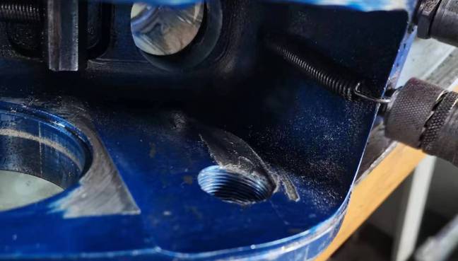 我們拆解檢查發(fā)現,改扳手的兩側驅動板在同一位置發(fā)生斷裂,油缸外沿刮擦缺損嚴重,殼體內腔出現嚴重刮削凹痕,整個扳手內部充滿金屬碎屑。從各部位損傷跡象我們可以推導出最先出現問題的應該是驅動板。長期高負荷運行或者使用過程中的受力不均導致液壓扳手驅動板出現損傷,但彼時并沒有達到非常嚴重的斷裂,扳手有些微卡但依然能夠轉動使用,導致操作人員沒有及時發(fā)現和處理。但這個時候裂痕使得驅動板不再光滑,并與殼體及油缸外沿產生接觸和刮削嚴重損傷了油缸和殼體。同時,刮擦下來的金屬碎屑又在運動中進入棘輪棘爪,對棘輪棘爪也造成了不小傷害。本來只用更換驅動板,卻差點毀了整個扳手。
