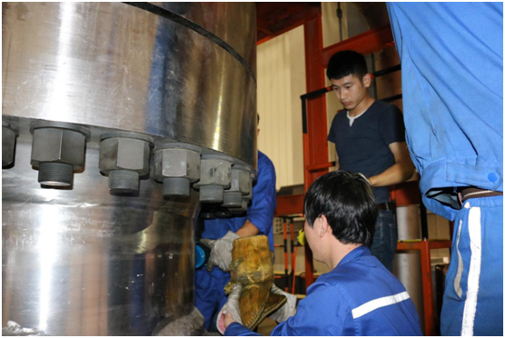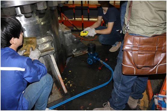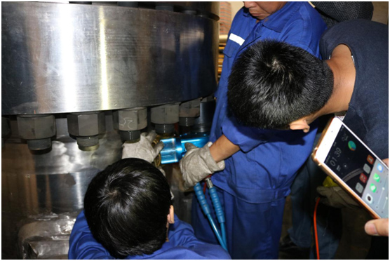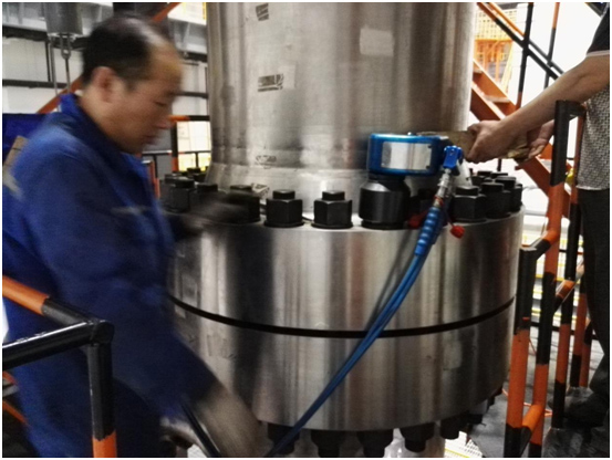 現(xiàn)場工作人員非常認(rèn)真地與波霆機(jī)械工程師進(jìn)行交流、探討以及學(xué)習(xí)液壓扳手的正確操作方法。培訓(xùn)剛剛結(jié)束大家就開始忙碌起來,對應(yīng)兩個法蘭現(xiàn)場工人分成兩組,每組三個人,采用兩同步拆卸螺栓。